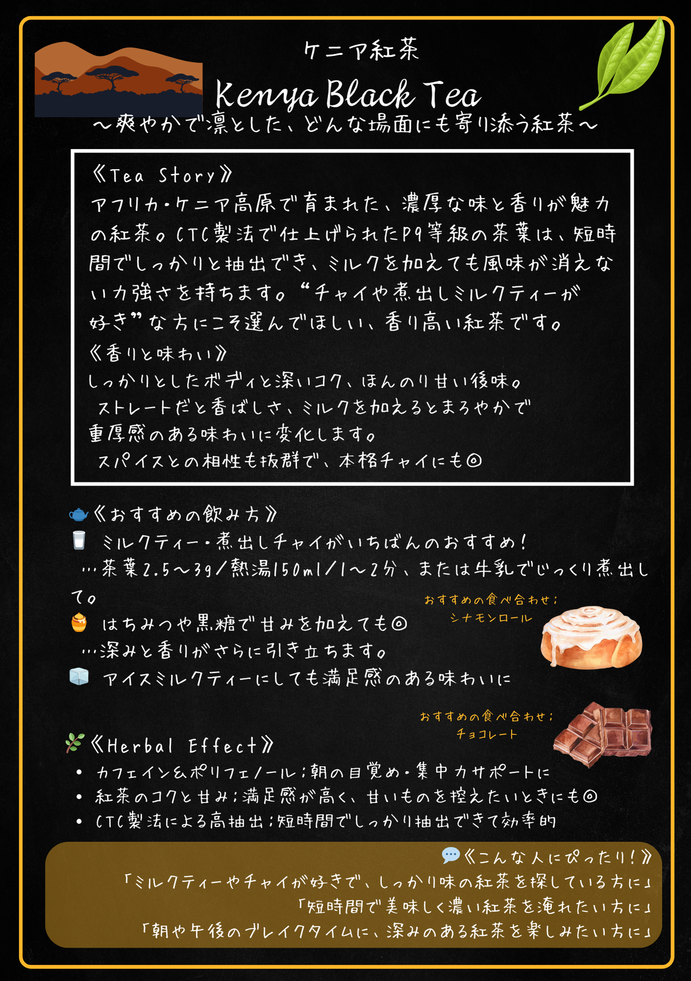 特徴: アフリカ・ケニア産の紅茶らしい深いコクと力強さが特徴の、P9グレード茶葉。しっかりとしたボディ感と、ほんのり甘く香ばしい風味が広がり、ミルクティーやチャイにも最適な万能タイプ。