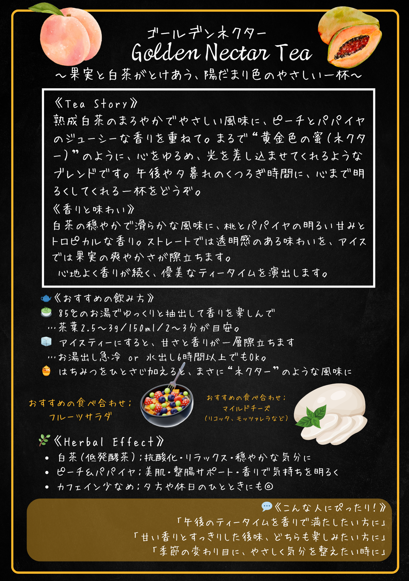 熟成白茶のまろやかでやさしい風味に、ピーチとパパイヤのジューシーな香りを重ねて。まるで“黄金色の蜜(ネクター)”のように、心をゆるめ、光を差し込ませてくれるようなブレンドです。午後や夕暮れのくつろぎ時間に、心まで明るくしてくれる一杯をどうぞ。