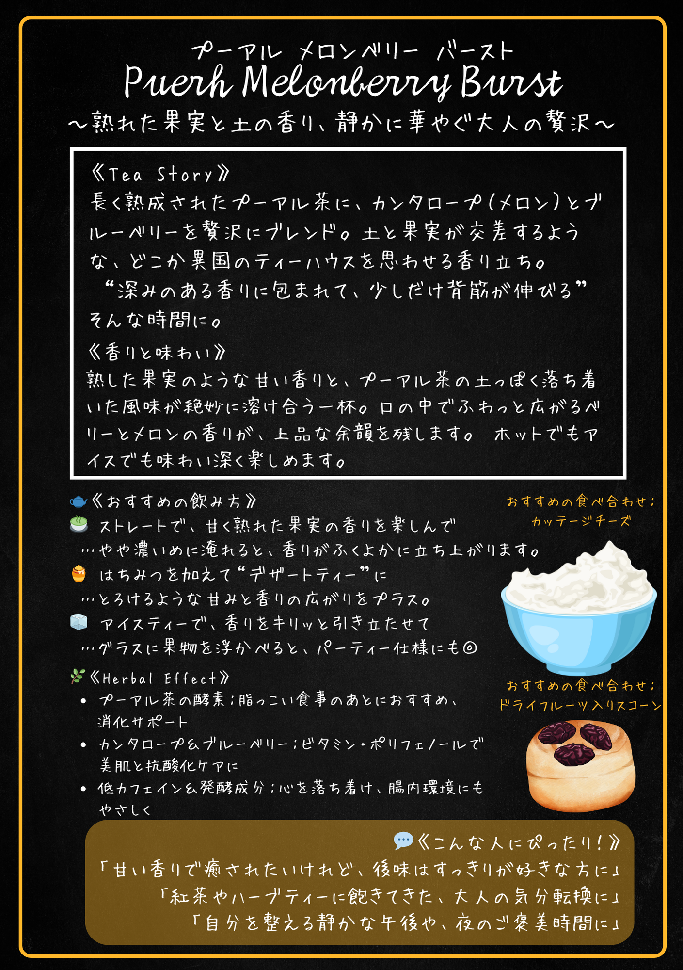 長く熟成されたプーアル茶に、カンタロープ(メロン)とブルーベリーを贅沢にブレンド。土と果実が交差するような、どこか異国のティーハウスを思わせる香り立ち。