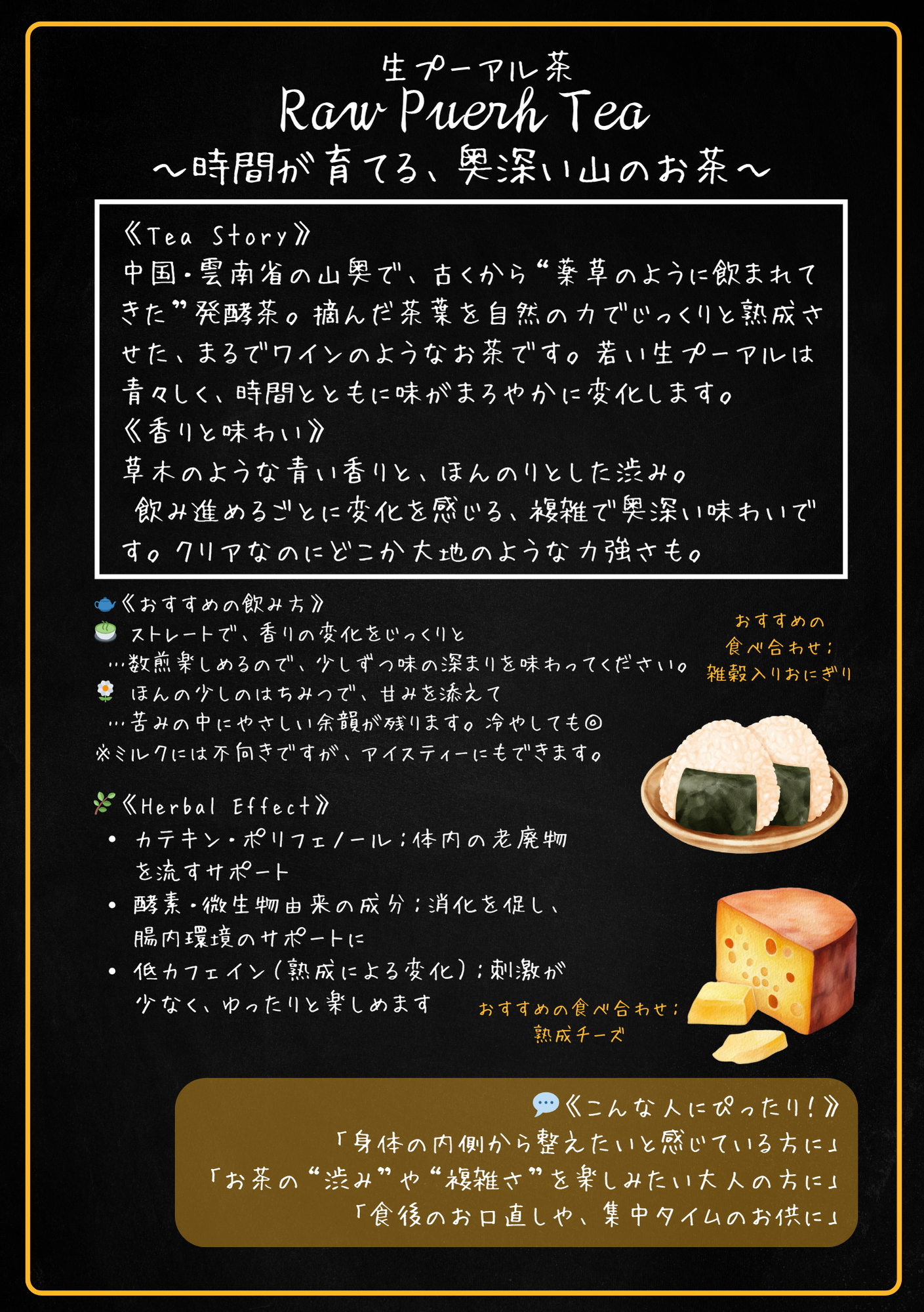 中国・雲南省の山奥で、古くから“薬草のように飲まれてきた”発酵茶。摘んだ茶葉を自然の力でじっくりと熟成させた、まるでワインのようなお茶です。若い生プーアルは青々しく、時間とともに味がまろやかに変化します。